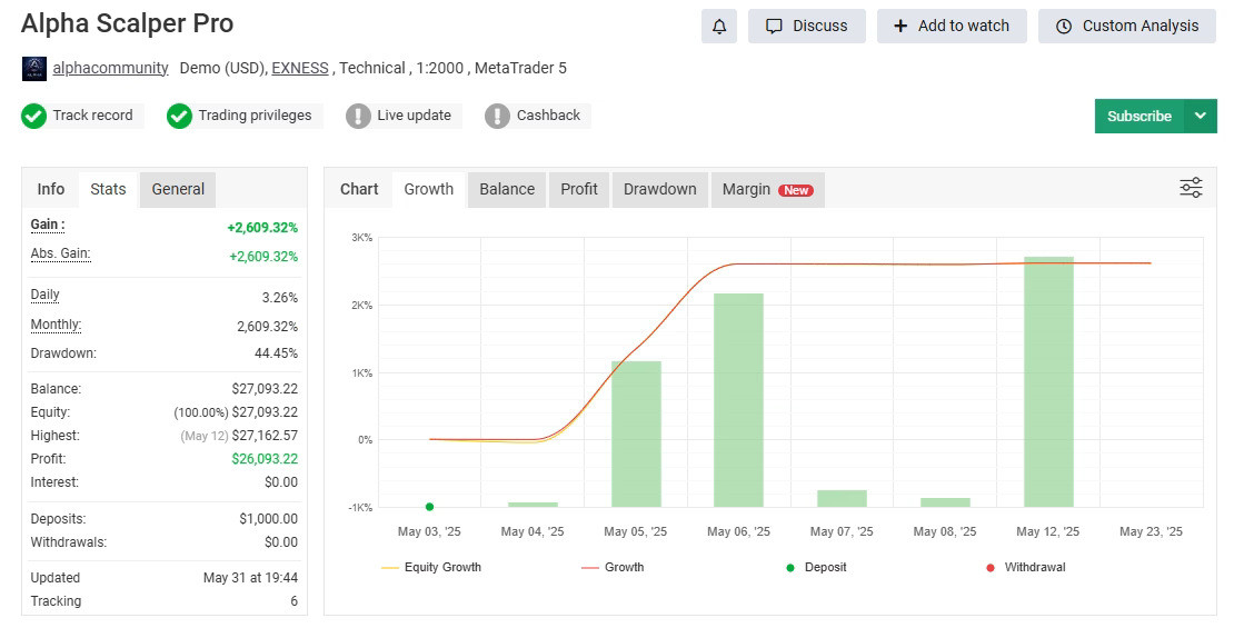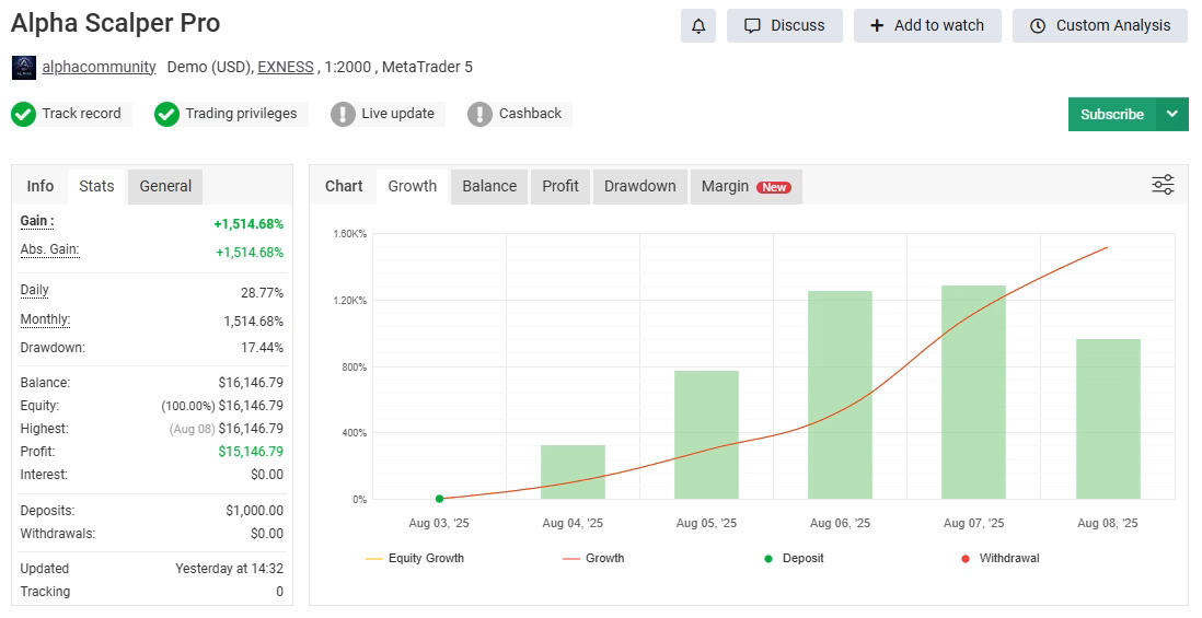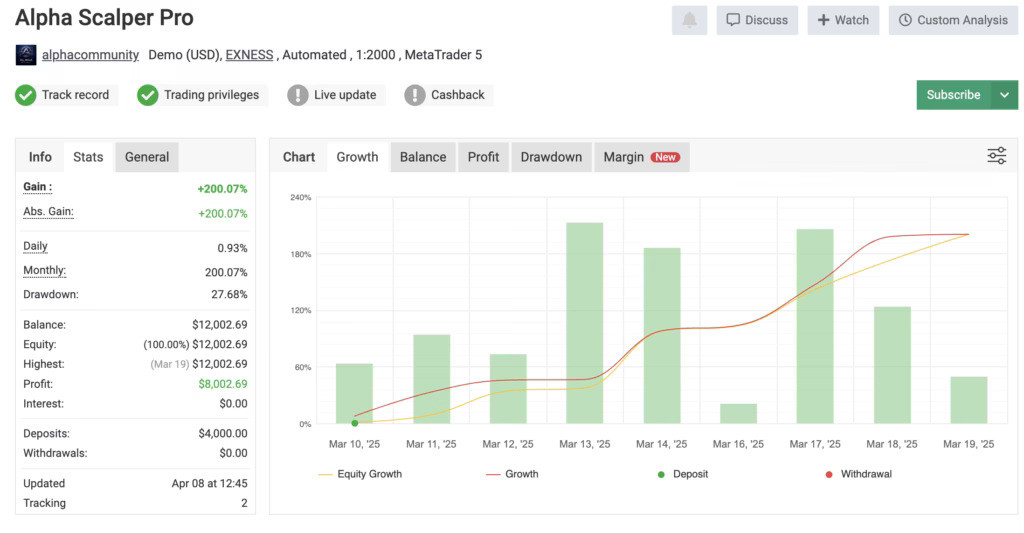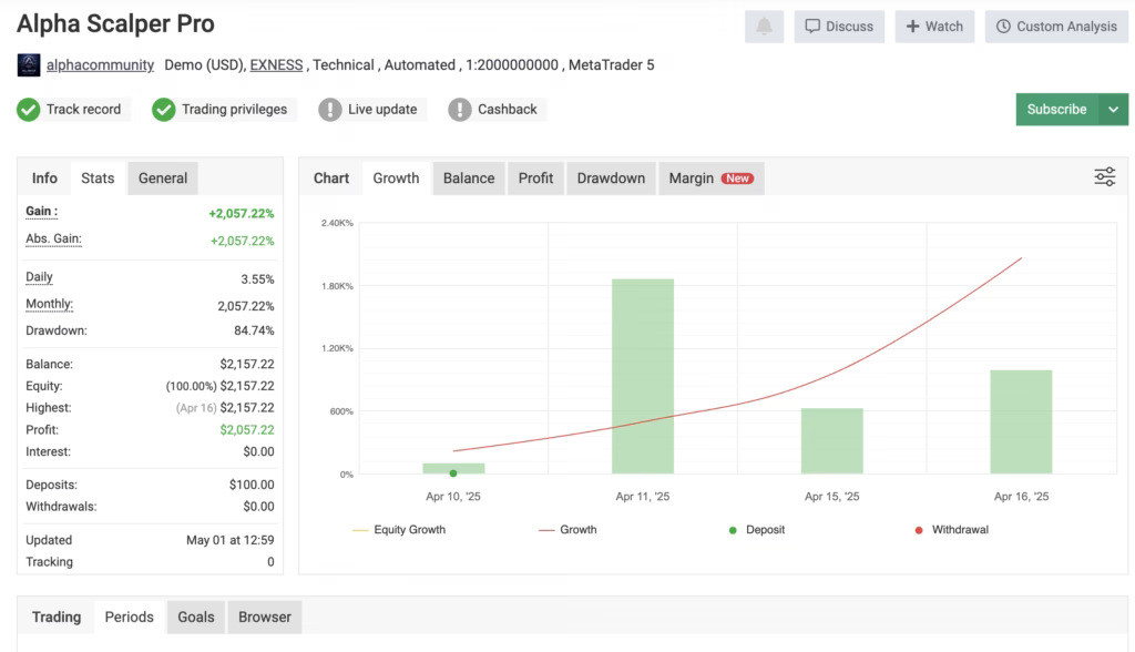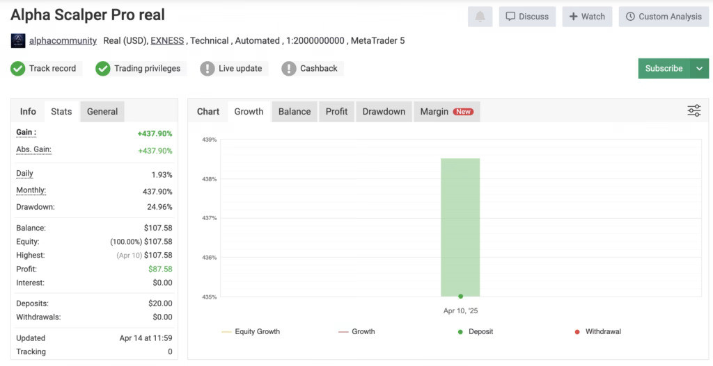 Alpha Scalper Pro MT5 Unlimited is an AI-powered scalping Expert Advisor (EA) for traders seeking consistent profits in gold (XAUUSD) and high-volatility Forex markets.
