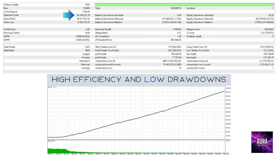Trained and backtested from 1999 to 2023 with 99.9% tick data, Aura Neuron MT4 delivers consistent performance even under varying market conditions. This EA is also prop firm-ready (FTMO compatible), ensuring compliance with strict trading rules.
