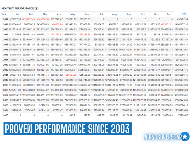 Tested and proven since 2003, Aura Superstar ensures consistent performance without using any risky methods such as martingale, grid, or hedging—making it ideal for traders who value both safety and innovation.